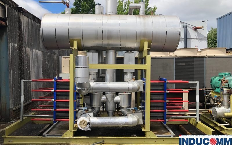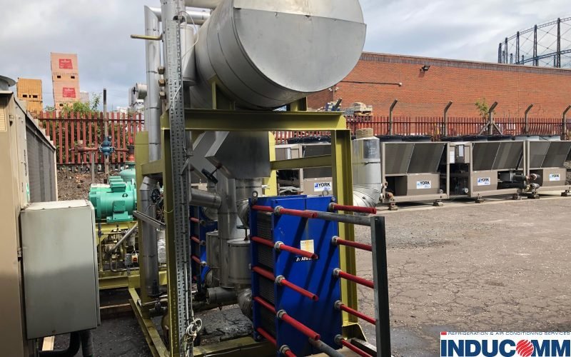Used and in good condition Bitzer triplex screw pack complete with low pressure vessel and gravity fed plate heat exchanger suitable for a pumped chilled glycol system. Original design conditions for the pack are 495 kW at Te -10C condensing 35C.