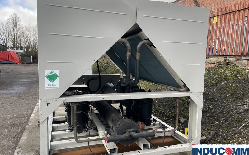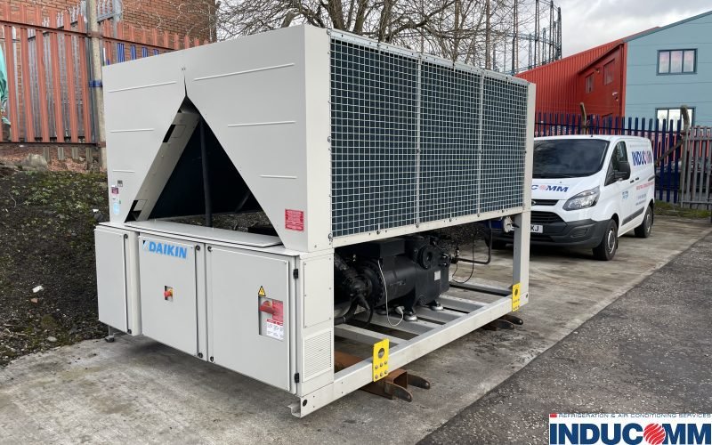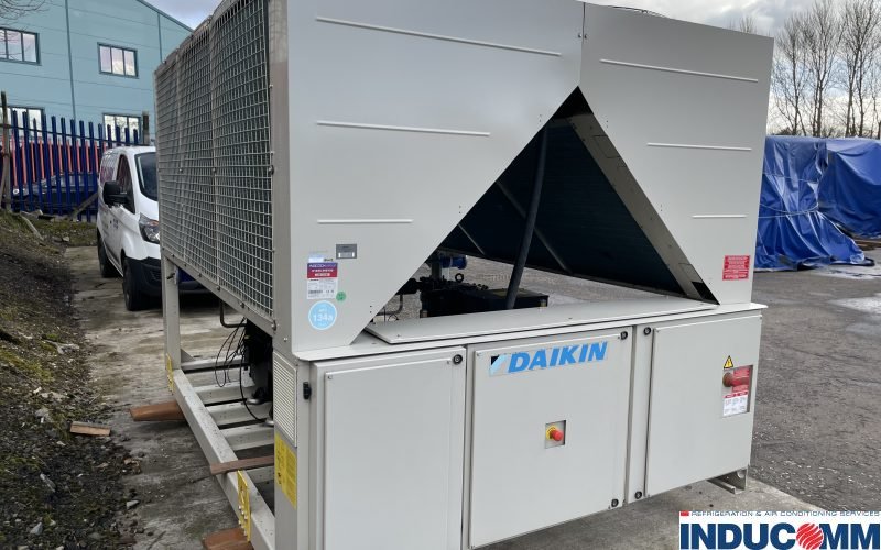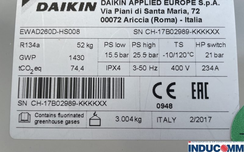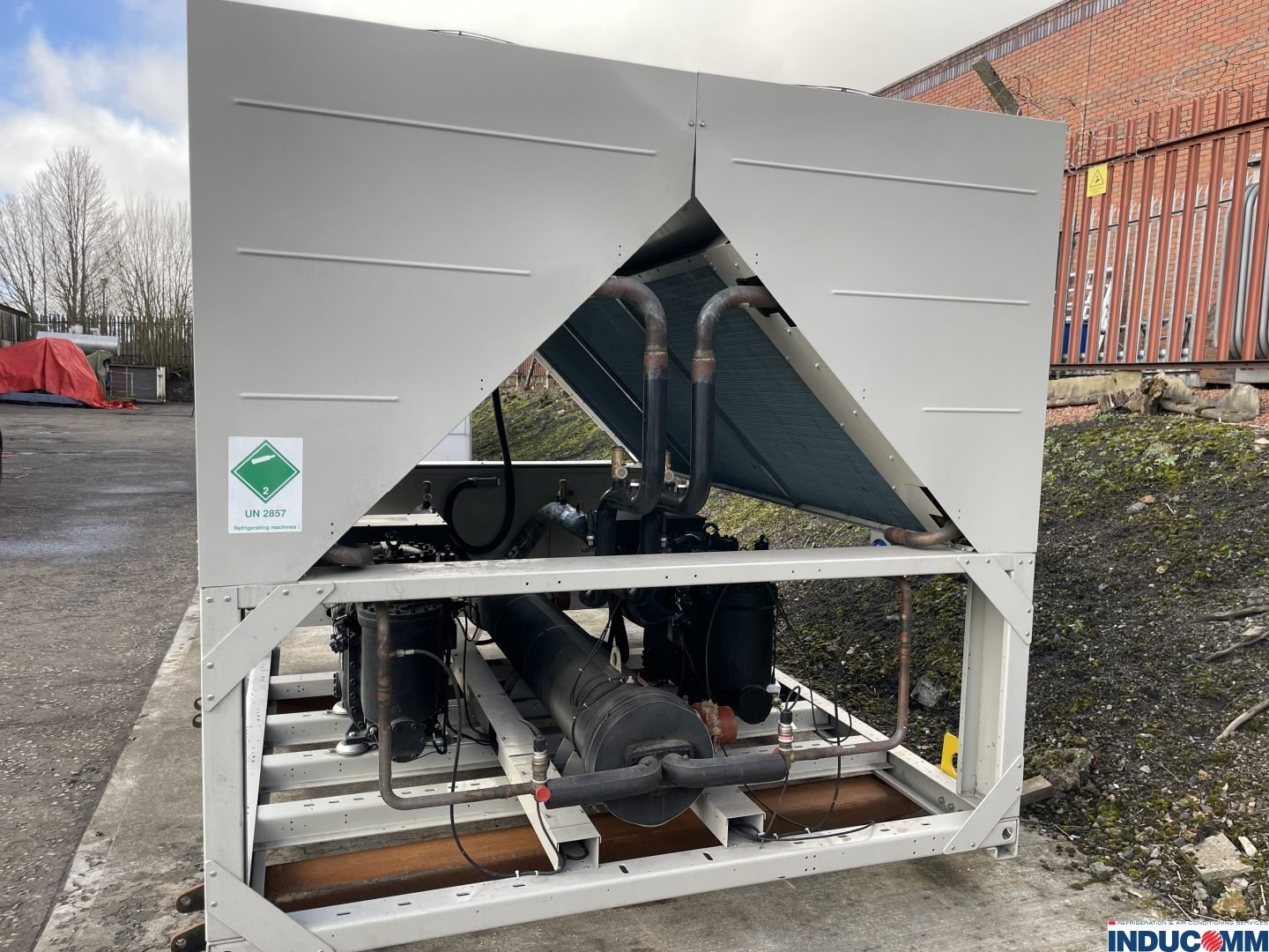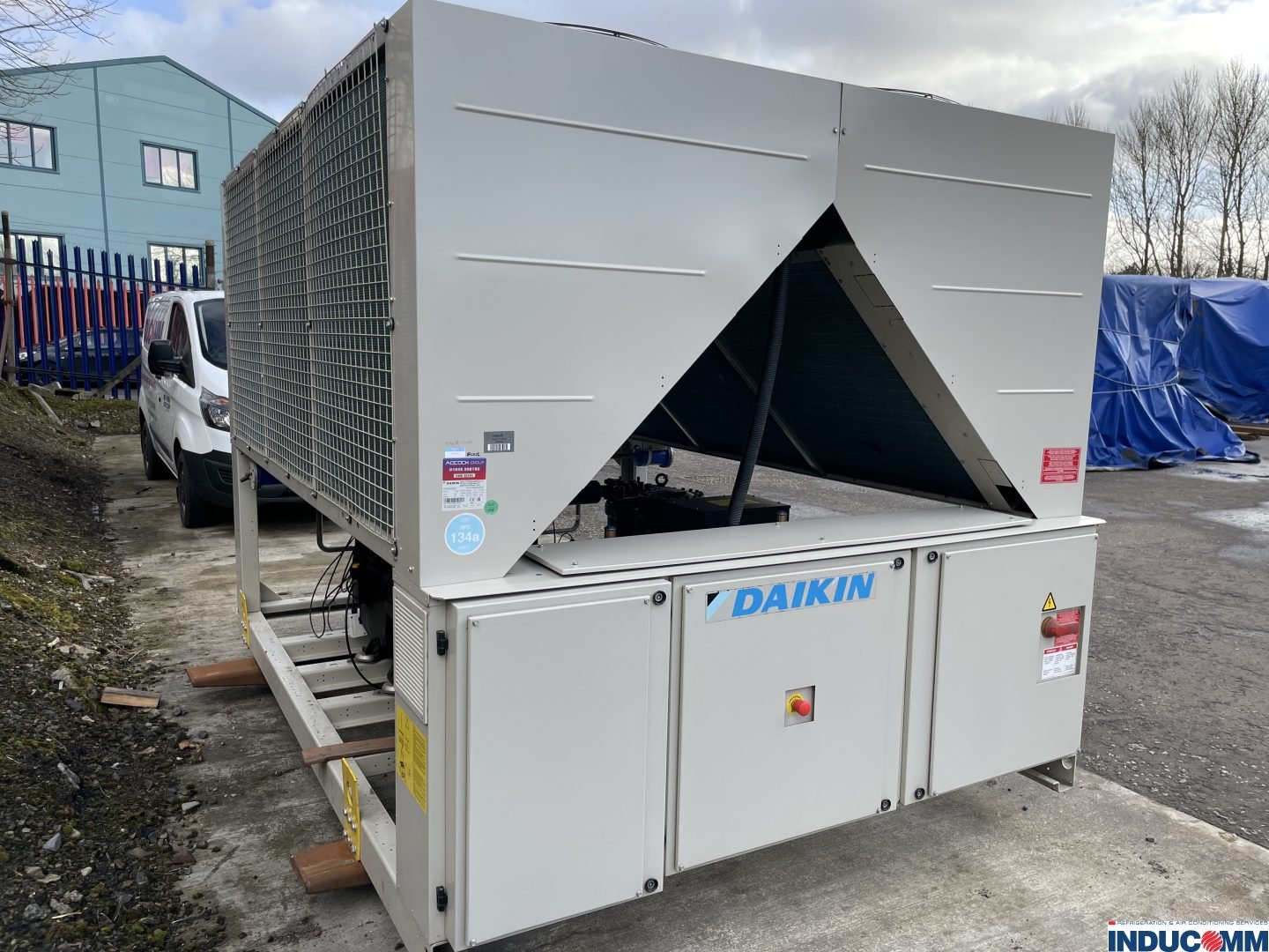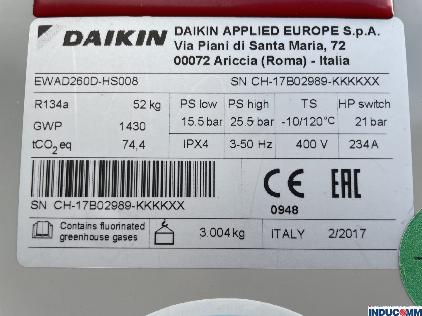 Daikin EWAD260D used chiller for sale in excellent condition. This air cooled water chiller is a 2017 model running on refrigerant R134A. The chiller is a twin circuit configuration utilising high efficiency semi hermetic screw compressors. A shell and tube type evaporator allows for a wide temperature range including negative temperature glycol applications. The condenser coils are CuAl and come with epoxy coating for corrosion protection. The chiller is in running condition and available for delivery within 3 working days.